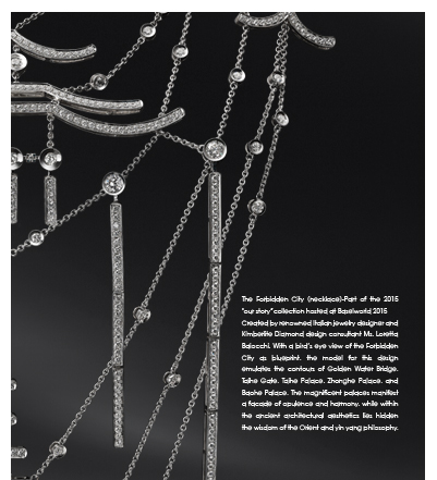 Created by renowned Italian jewelry designer and Kimberlite Diamond design consultantMs. Loretta Baiocchi. With a bird's eye view of the Forbidden City as blueprint, the model for this design emulates the contours of Golden Water Bridge, Taihe Gate, Taihe