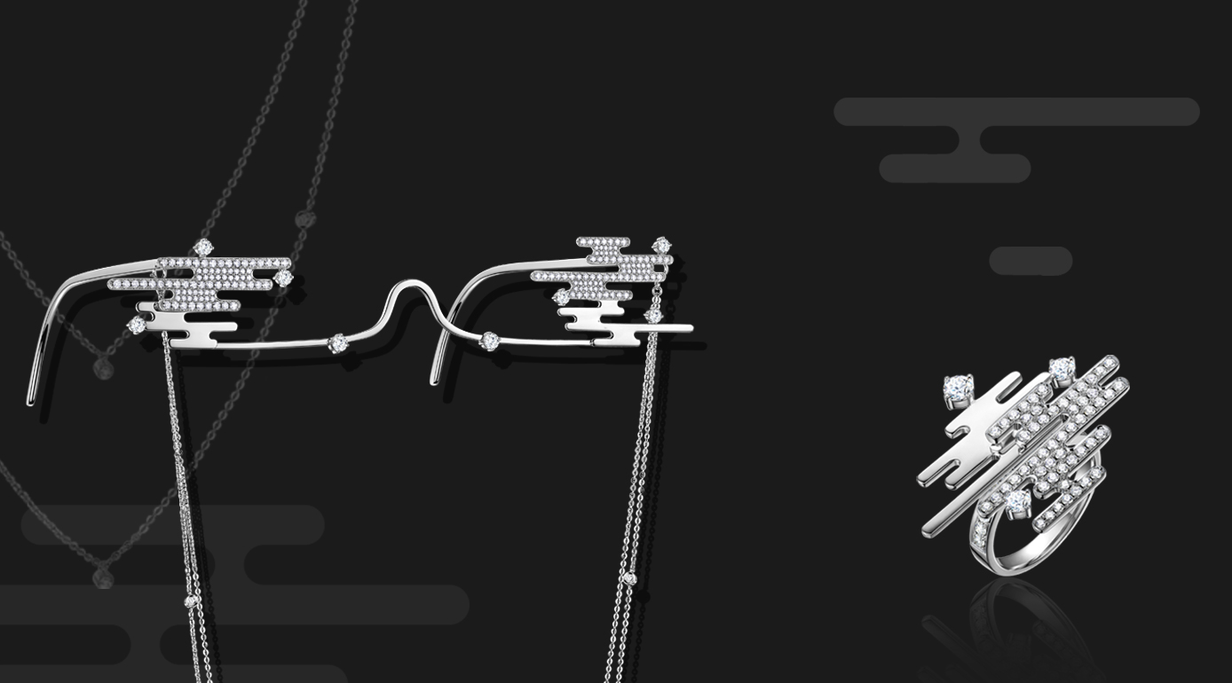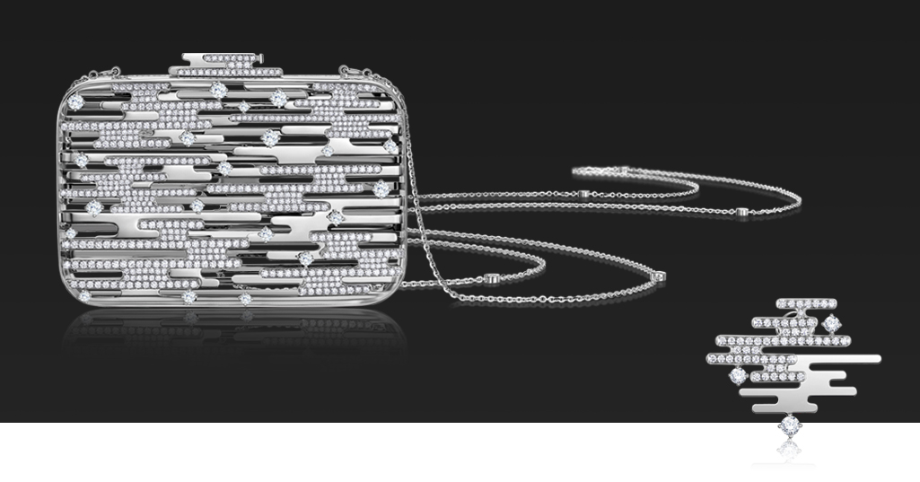 As children, we all stared up at the sky and the objects in it with awe and wonder. In this set, the designer creates a minimalist rendering of the profiles of a clouded nighttime sky, and its layered patterning mimics the effect of looking up at the shimmering heavens through a wall of flowing clouds, who pursue and envelop one another in their journeys across the skies in this peaceful and romantic arrangement. The full set includes a necklace with a handbag-shaped pendant, a bracelet, and a set of glasses. Each piece is a fascinating, complex work of art, filled with innocence and grandeur.