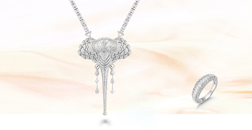 Ivory White Tower - The elephant is the largest land animal in the world today. The designer, inspired by the Asian elephant, outlines the elegant lines of the elephant’s head. Both iconic features of the elephants, the nose and the fan-shaped ears, are portrayed gorgeously. Diamonds are used to replace the ivory tusks, highlighting the precious nature of ivory and expressing opposition to poaching and smuggling.