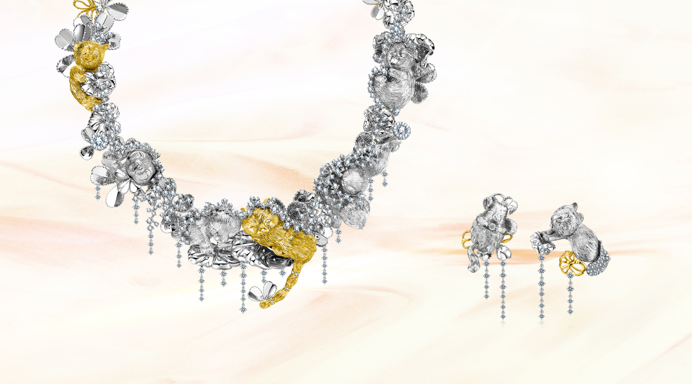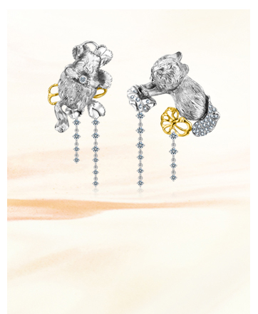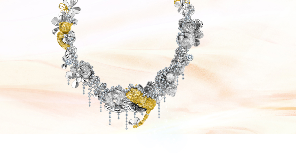 First Sight - Creative concept: this series is inspired by 8 endangered animals: the Iberian lynx, the ochotona iliensis, the snow leopard, the lesser panda, the polar bear, the sea otter, the black-footed ferret, and the Chinchilla. The animals are awakening from deep slumber, or sitting, or standing, each charming in its natural innocence. Diamonds symbolize melting ice and snow, surrounded by alfalfa leaves and saxifrage, producing a piece full of life which echoes the theme of protecting animal habitats.