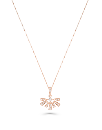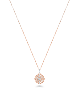 Its teardrop shape reflects the resplendence of the center diamond with patterns engraved by a CNC turning tool and diamonds inlaid around its edge. This pendant shimmers like a pure pearl in the sea, showcasing the graceful air of the woman who wears it.