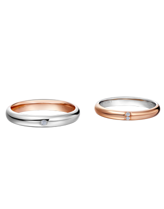 The designer paved half the diamond surface with rose gold, combined withan elaborate beading process to present the symbol of “Eternity∞”in a simple style. It is an eternal commitment to love and promise. The inside of the men’s ring is inlaid with a single round and elegant diamond.