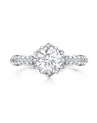 This classic six-claw setting has been significantly elevated, making the small diamonds on the claw inlay serve as a cape covering all edges of the main diamond and contrasting the fine dewdrop-edge along the shank. This design emphasizes woman’s refined temperament and aspirations to charm and nobility.