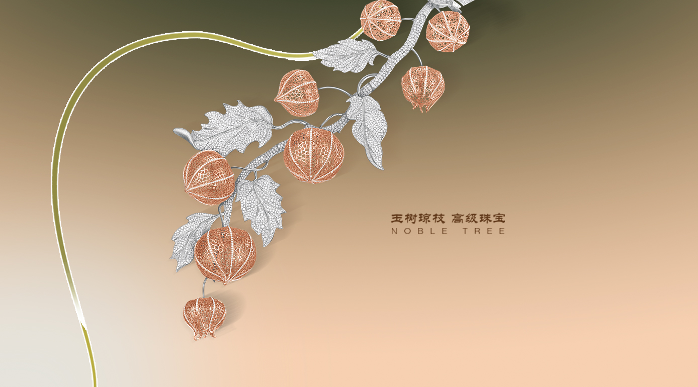 作品以肩飾的形式展現(xiàn),新穎有趣,榮獲2022香港JMA國際珠寶設(shè)計比賽公開組Ⅱ-冠軍和最佳工藝制作獎。用18K玫瑰金打造鏤空的燈籠草造型,葉片正面鑲嵌大小不一的鉆石如冰雪般晶瑩剔透,背面采用勾絲工藝,一紅一白的鮮明對比,展現(xiàn)雪后詩意之美,充滿著勃勃生機和春意盎然的溫暖。