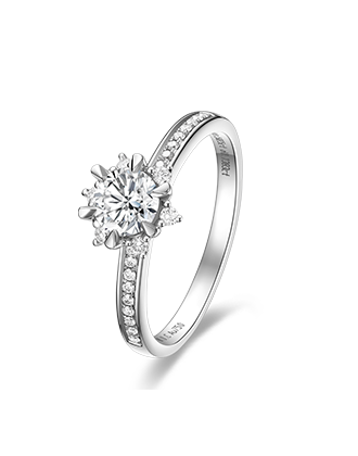以明媚的太陽(yáng)花為靈感,用六圍一的鑲嵌方式將鉆石打造成太陽(yáng)花造型,戒壁一分為二交錯(cuò)疊放,呈現(xiàn)出手捧花的模樣,詮釋著愛情中彼此溫暖、相互鼓勵(lì)的堅(jiān)韌力量。